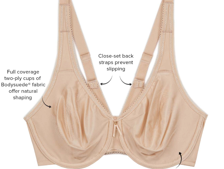 - Full coverage two-ply cups of Bodysuede® fabric offer natural shaping