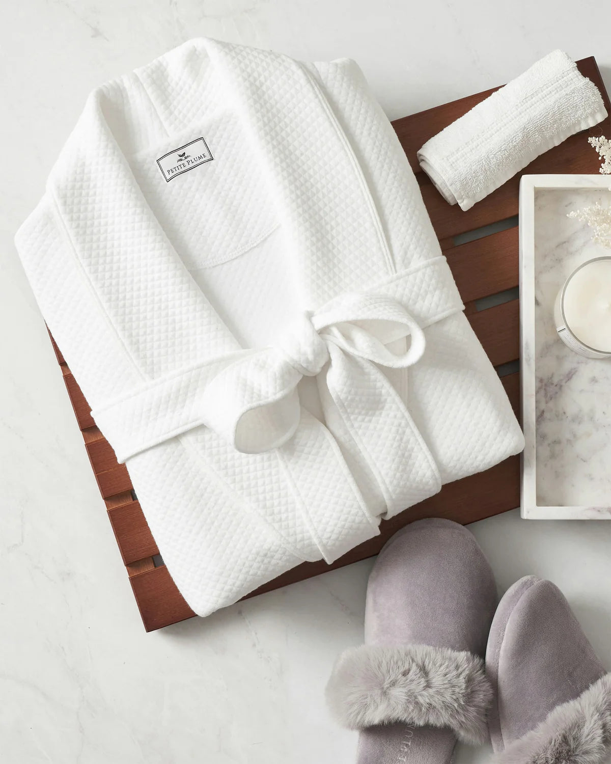 Petite Plumes Classic Womens Robe made of Luxurious, Heavy, Peruvian Pima cotton in a delightful textured matelassé. This robe is made of a blend of fabrics, allowing for the sophisticated quilted effect. However, the buttery soft fabric against your skin is made only with the finest Pima Cotton and Modal. Curl up in luxury.